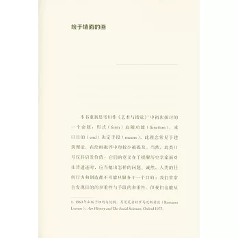 本書是藝術史學家貢布裡希關於濕壁畫的經典著作。文藝復興時期,繪畫和雕塑擺脫了中世紀以來依附於建築的附庸地位,成為獨立的藝術種類,其中便包含畫在沒有乾透的牆壁上的濕壁畫。